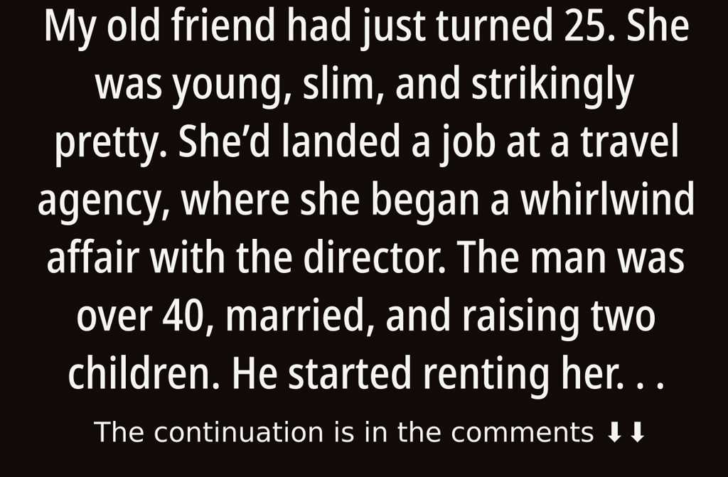 Gradually, the director grew distant from his mistress, who, in desperation, began to act out and insult him. His wife, meanwhile, blossomedher charm was undeniable. The affair unraveled, and the man started spending his evenings at home again. The turning point came during a business trip the three had to take together. My friend, thinking her status in the company was special due to the affair, acted rudely during negotiations. She thought herself above the rest.