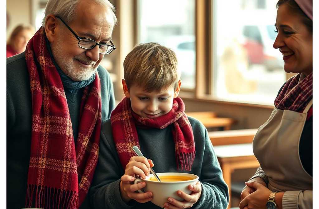 And so the unlikely triogranddad, grandson, and the everready Daisykept returning to All for the Gents, where warm soup, a slice of cake, and a dash of humour kept the cold at bay.