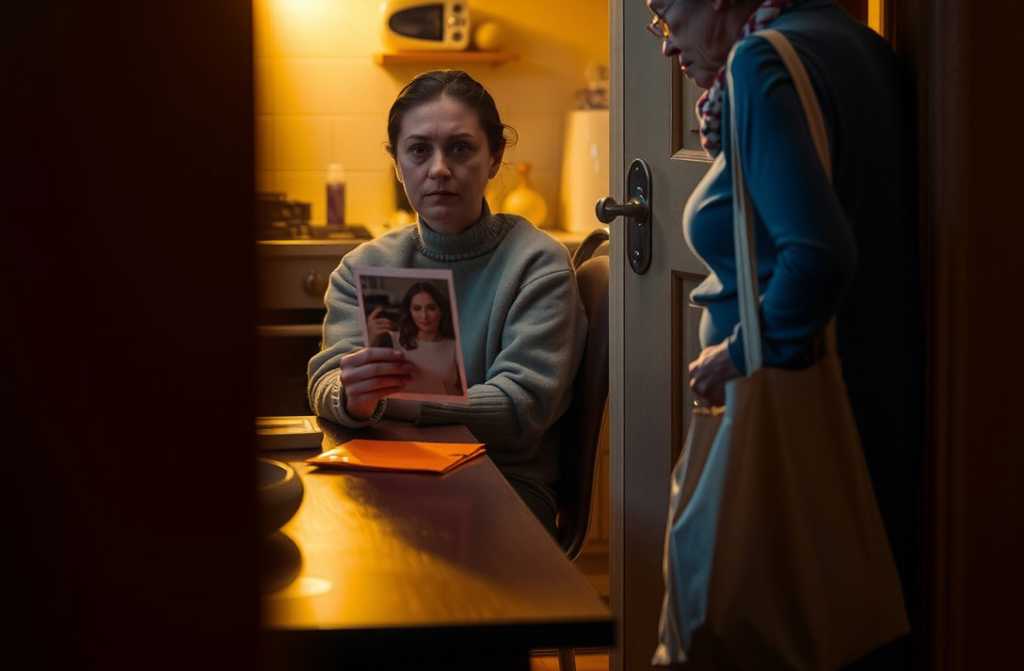 Her face. Thirty-eight now. Brown hair just grazing her shoulders, curling from damp. Skin not grey. Just there, with a blush from evening tea. Shadows under her eyes, but not the bruises from the photo. Just tired, working-woman shadows.