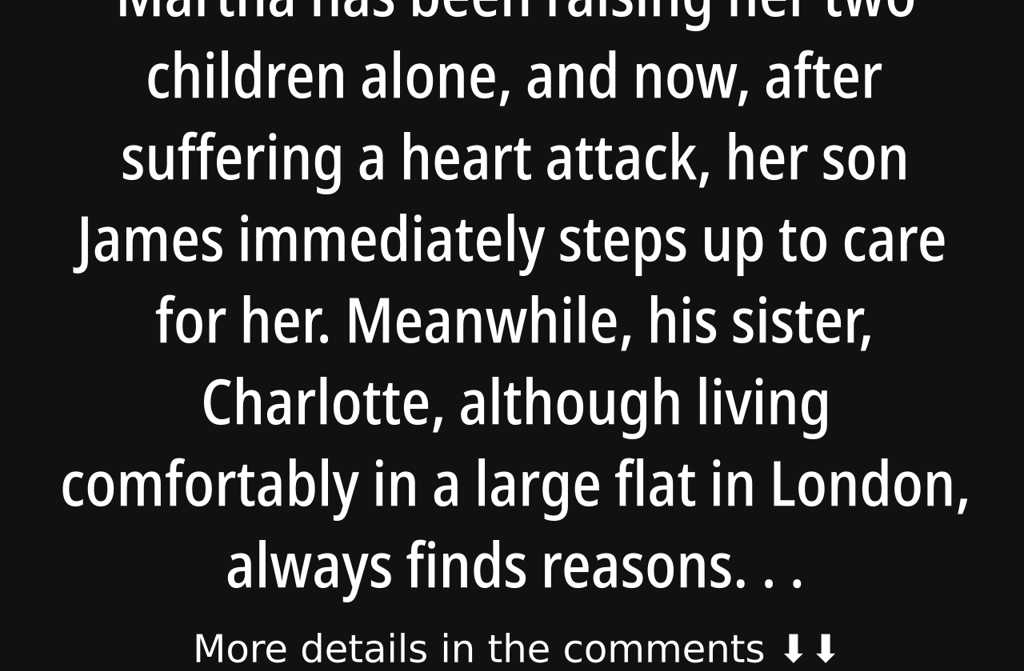 Martha has been raising her two children alone, and now, after suffering a heart attack, her son James immediately steps up to care for her. Meanwhile, his sister, Charlotte, although living comfortably in a large flat in London, always finds reasons not to help with their ageing mothers care.