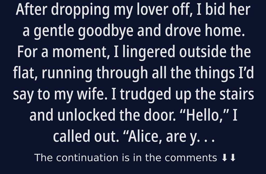 After dropping my lover off, I bid her a gentle goodbye and drove home. For a moment, I lingered outside the flat, running through all the things Id say to my wife. I trudged up the stairs and unlocked the door.