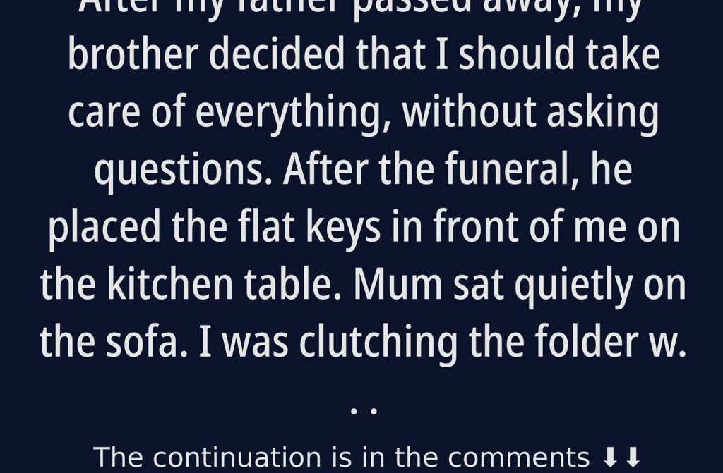 After my father passed away, my brother decided that I should take care of everything, without asking questions. After the funeral, he placed the flat keys in front of me on the kitchen table. Mum sat quietly on the sofa. I was clutching the folder with all the paperwork, feeling bewildered at how Id suddenly become the person expected to make all the decisions.