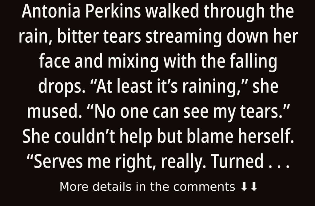 Antonia Perkins walked through the rain, bitter tears streaming down her face and mixing with the falling drops.