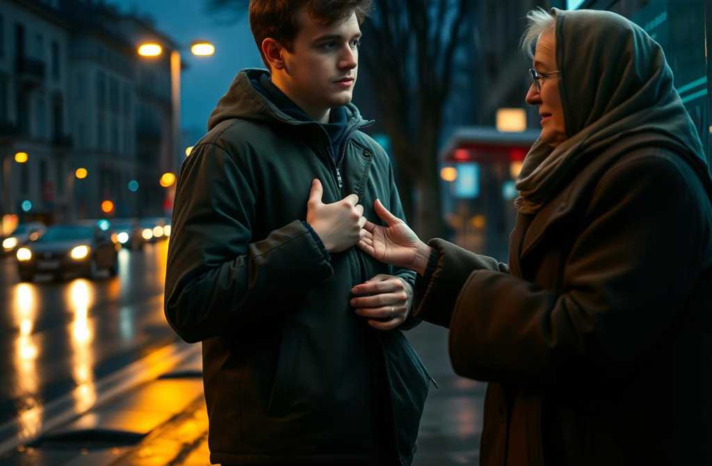 Через кілька тижнів Ярослав знову стояв на тій самій зупинці, цього разу під крижаною мрякою. На ньому було те саме старе пальто, його тканина все ще пахла деревяним димом і часом. Поряд тремтів підліток у тонкій кофтині, намагаючись сховати руки в рукавах.