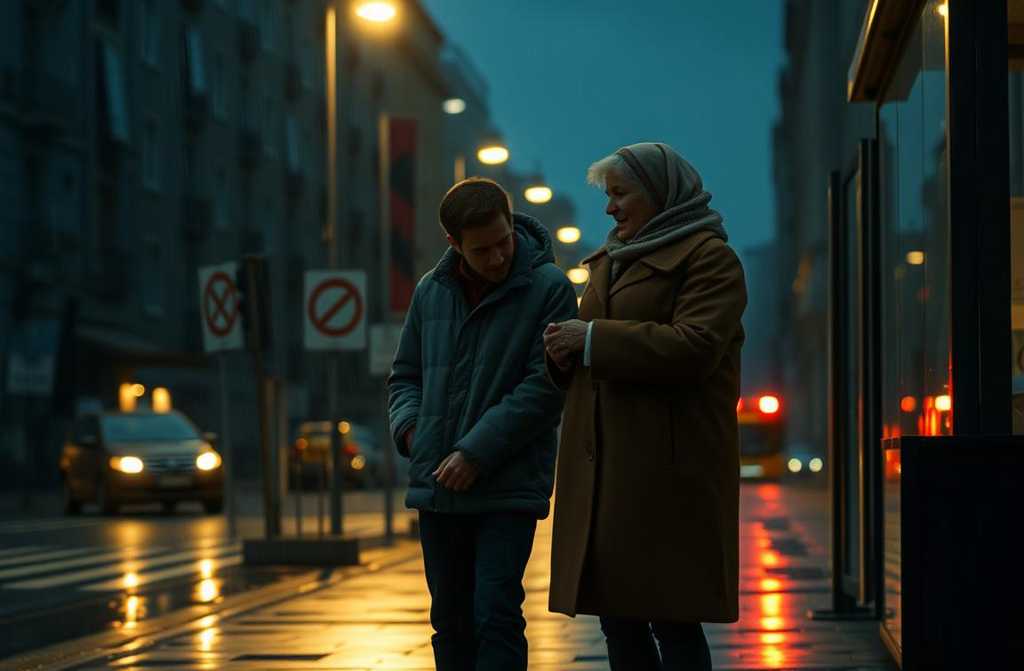 Через кілька тижнів Марія знову стояла на тій самій зупинці, цього разу під холодною мрякою. На ній було те саме старе пальто, в тканині якого все ще відчувався легкий присмак деревного диму та часу. Поряд тремтів підліток у тонкій кофтині, безуспішно намагаючись сховати руки в рукавах.