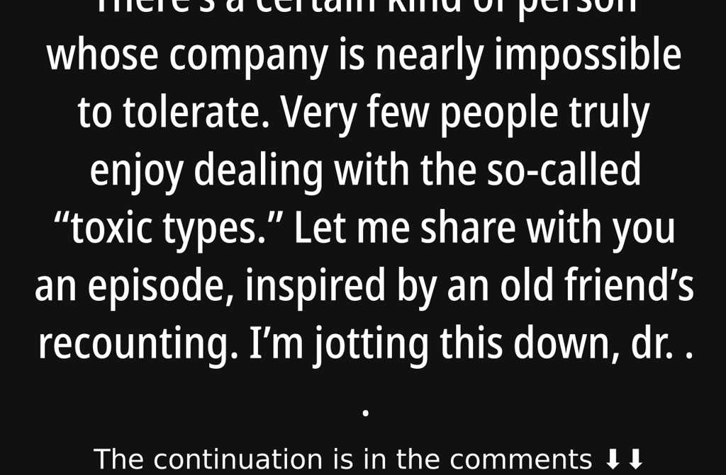 Theres a certain kind of person whose company is nearly impossible to tolerate. Very few people truly enjoy dealing with the so-called toxic types. Let me share with you an episode, inspired by an old friends recounting. Im jotting this down, drawing from the impressions she left me with regarding that nerve-wracking day.