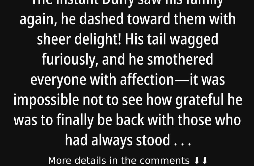 The instant Duffy saw his family again, he dashed toward them with sheer delight! His tail wagged furiously, and he smothered everyone with affectionit was impossible not to see how grateful he was to finally be back with those who had always stood by him. What a touching reunion!