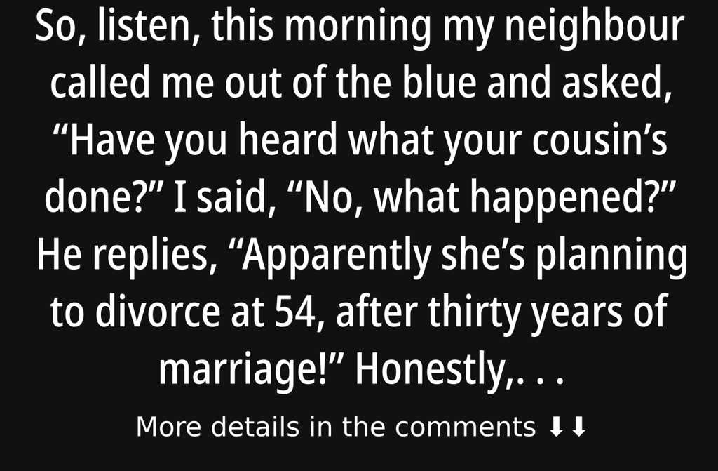 He replies, Apparently shes planning to divorce at 54, after thirty years of marriage!