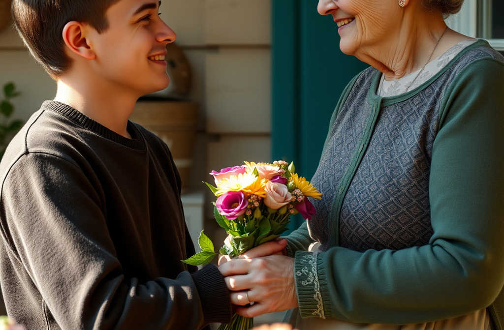 As he reached the village house and stepped inside, he divided the bouquethalf for his mother, half for his grandmother.