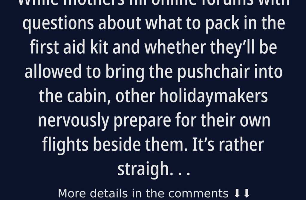 While mothers fill online forums with questions about what to pack in the first aid kit and whether theyll be allowed to bring the pushchair into the cabin, other holidaymakers nervously prepare for their own flights beside them. Its rather straightforward nowadays. If once someone might try to shame disgruntled passengers, reminding them that children are to be cherished, now airlines are being asked to create near-separate sections to keep families apart from others. When did it come to this?