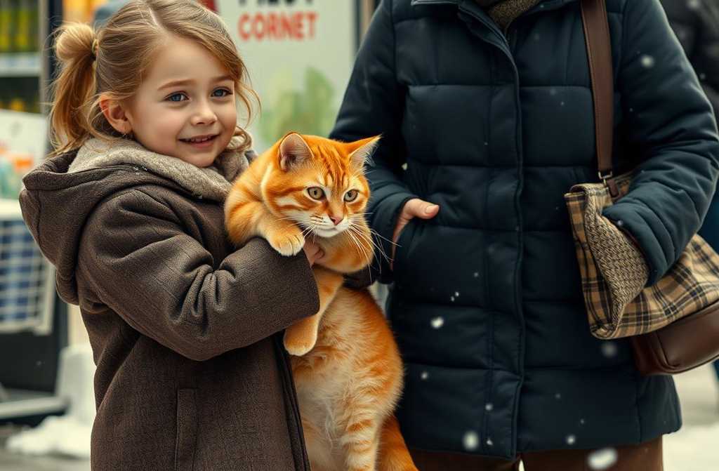 People bustled in and out of the supermarket, but a ginger cat sat perfectly still by the entrance, looking wise beyond its years, eyes half-lidded as if it couldnt be bothered with the world. Its front paws shifted just slightly from the cold. Emily crouched beside it and waved Charlotte off, signalling shed wait outside.