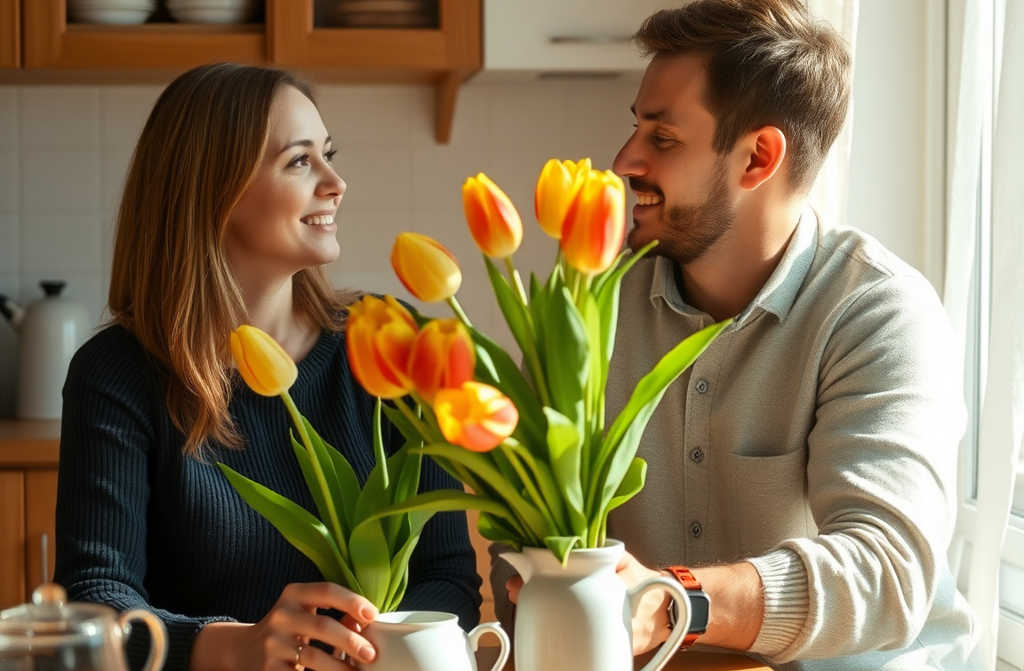 Yes, the groceries are in the car. I brought you something as well. He pulled out a modest bouquet of tulips. Emily took it, and her eyes lit up. They sat at the kitchen table, sipping tea and swapping small talk about the weather and market prices.