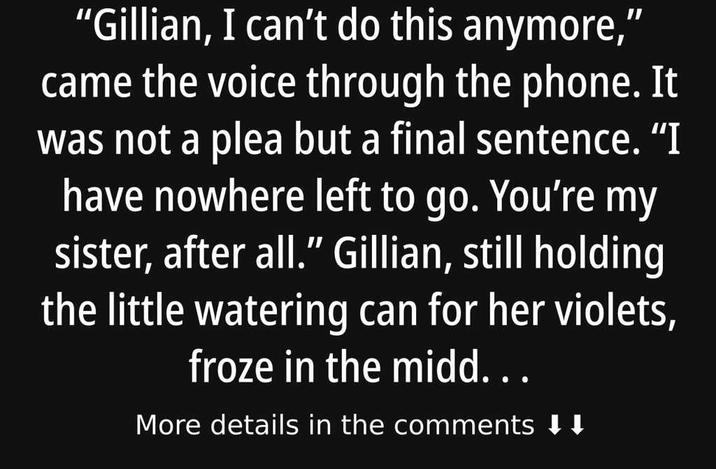 Gillian, still holding the little watering can for her violets, froze in the middle of her impeccably tidy kitchen. Outside, the April evening cast a soft pink hue across the sky; her saucepan of porridge simmered with the scent of frying onions in the air. Everything was exactly as it always was: quiet, calm, predictable. Right up until this call.