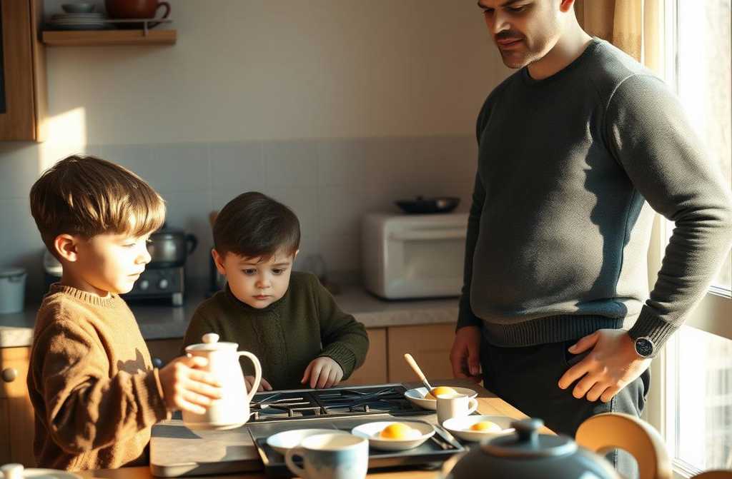 The lads burst in. The elderby five minutesput the kettle on. The younger grabbed the frying panhis turn to cook.