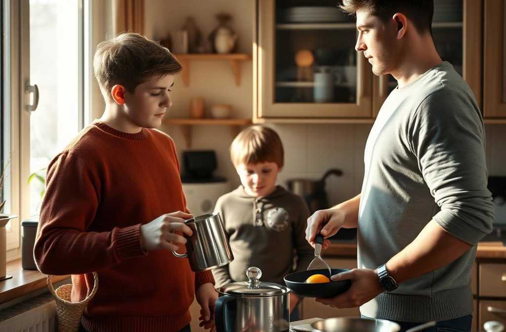 The “lads” burst in. The elderborn five minutes soonerset the kettle. The younger grabbed the pan; breakfast was his turn.