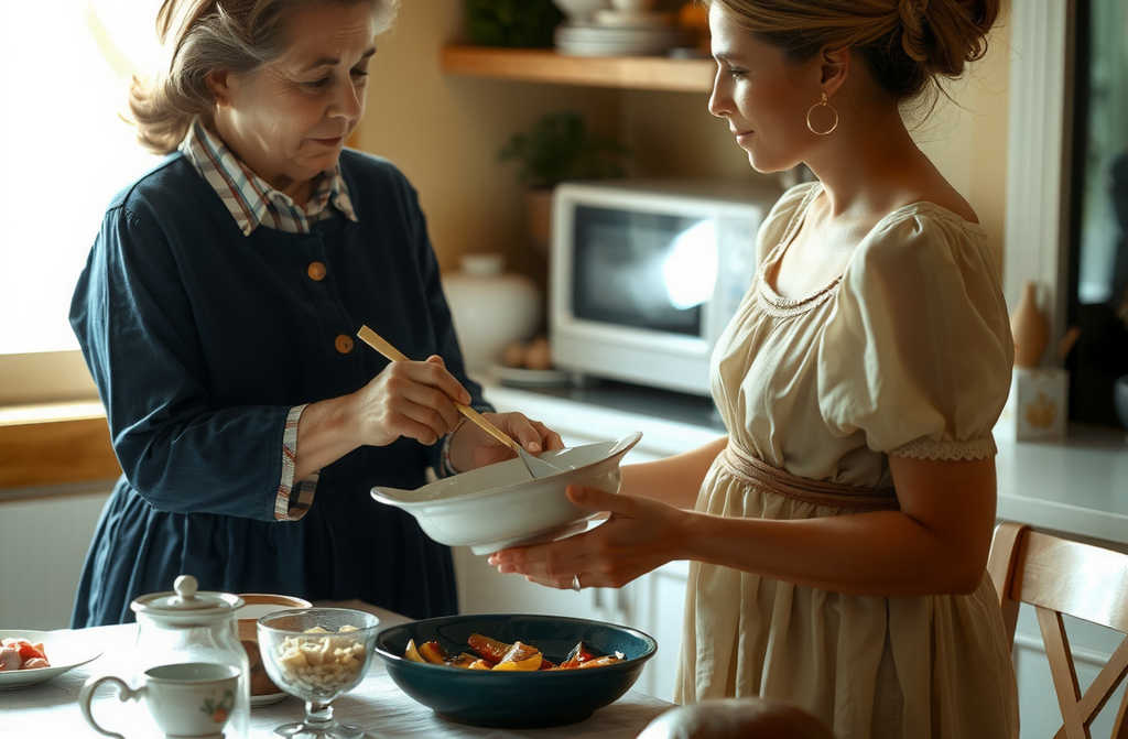 Margaret stood there, hand still hovering above her trusty wooden spoon, beside a simple kitchen table clothed in a faded but spotless tablecloth. The little cottage kitchen smelled of hot supper, fresh bread, and the slow, sweet end of a day in the countryside. The light in the room was warm and honey-coloured, soft as her heart.