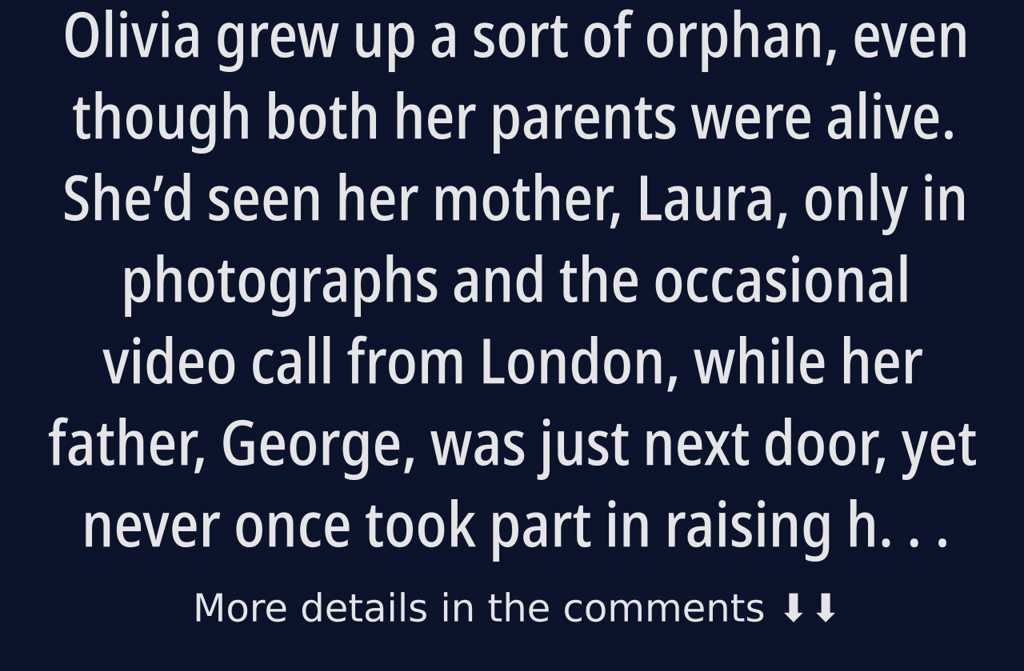 Olivia grew up a sort of orphan, even though both her parents were alive. Shed seen her mother, Laura, only in photographs and the occasional video call from London, while her father, George, was just next door, yet never once took part in raising her.