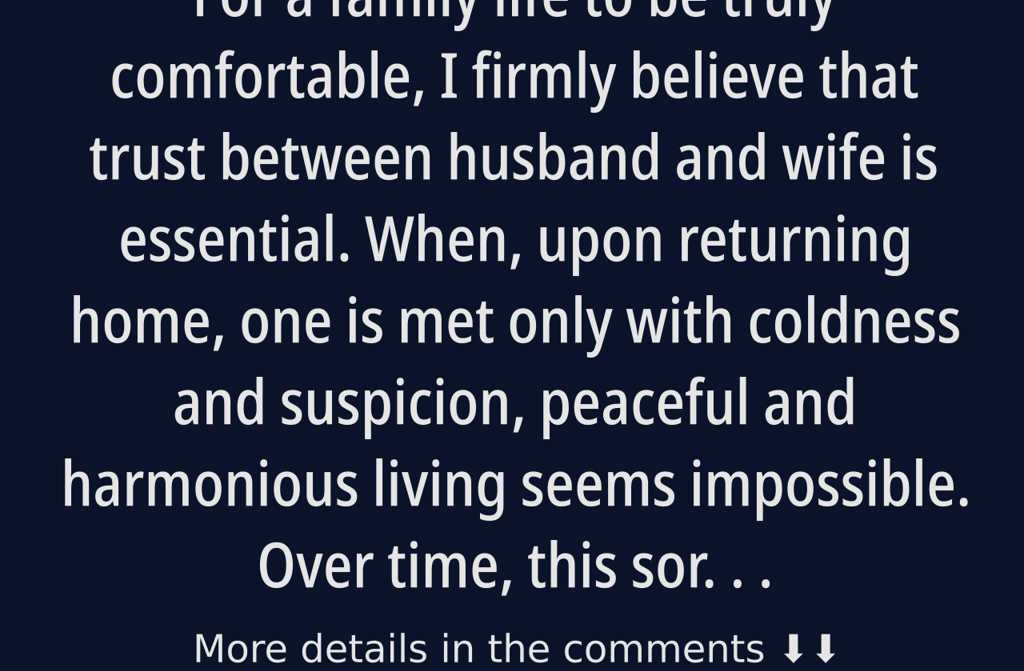 For a family life to be truly comfortable, I firmly believe that trust between husband and wife is essential. When, upon returning home, one is met only with coldness and suspicion, peaceful and harmonious living seems impossible. Over time, this sort of existence only leads to problems, slowly breaking down the bonds between those closest to each other.