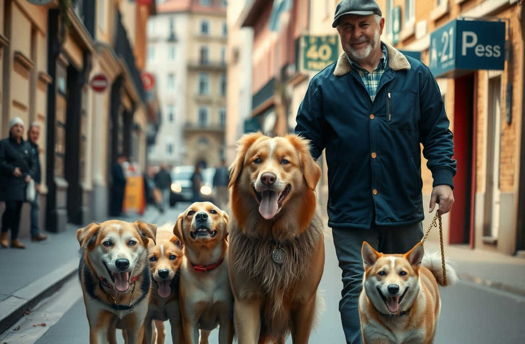 Now, each morning, he sets off early for work, striding down our quiet Manchester avenue with all five dogs trotting at his heels: four little ragtag pups with curly tails and one stately sheepdog in a golden collar with a bell that jingles.