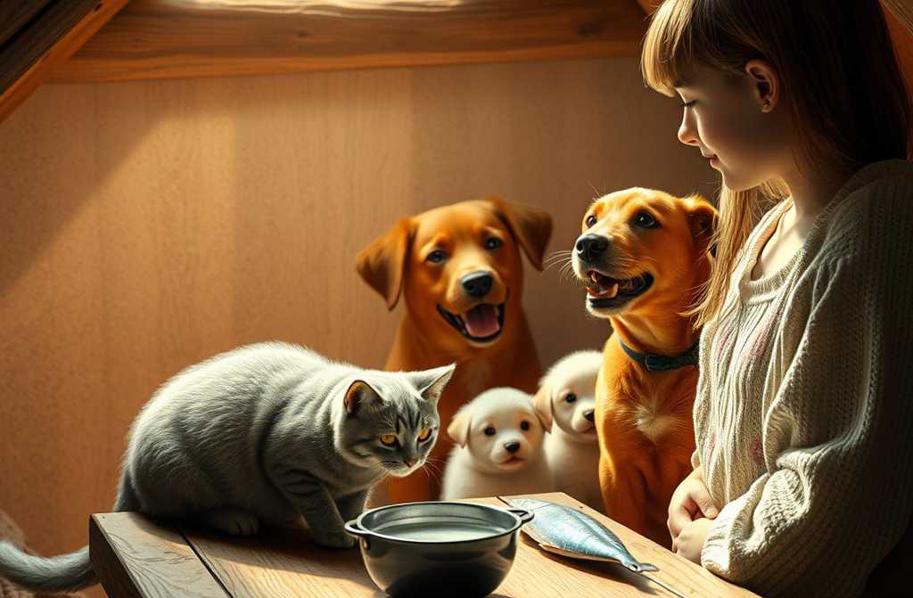 Tom, too weak to flee, stared cautiously. Molly, oblivious to his wariness, fed the puppies and the dog, then turned to him, placing extra bits of meat beside the tray.