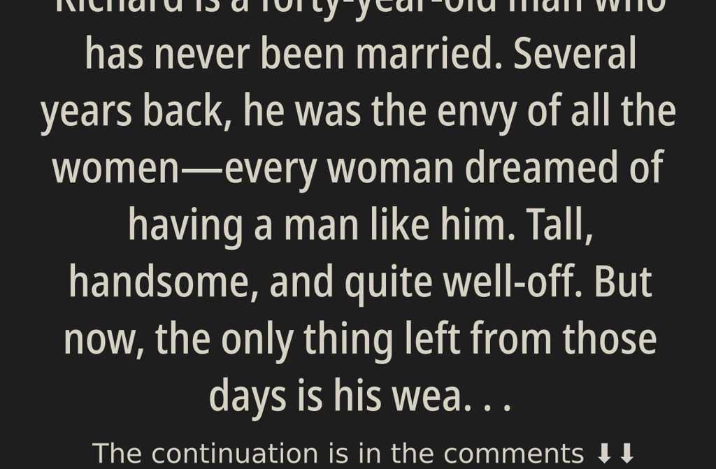 Richard is a forty-year-old man who has never been married. Several years back, he was the envy of all the womenevery woman dreamed of having a man like him. Tall, handsome, and quite well-off. But now, the only thing left from those days is his wealth. Hes no longer young, his hair is thinning, and hes working on quite the belly. Richard is well aware of this, and for the first time in his life, he started to seriously consider marriage. Still, he doubted whether hed be able to find a suitable wife, given his rather difficult personality: hes abrupt, strict, and rather harsh. Everyone around him knows what hes like, so women usually warn off anyone who shows a passing interest in him. Richard soon realised his chances werent great. He told his friends about his worries and, after taking their advice, he was married within a few months.