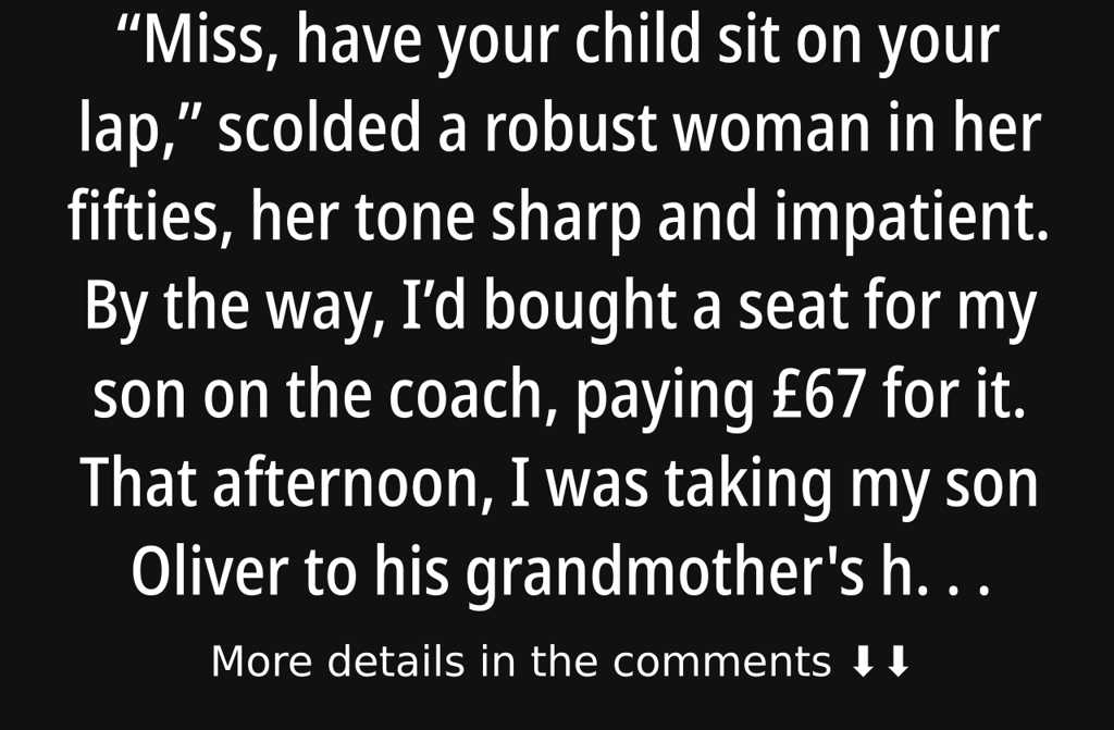 Miss, have your child sit on your lap, scolded a robust woman in her fifties, her tone sharp and impatient. By the way, Id bought a seat for my son on the coach, paying £67 for it.