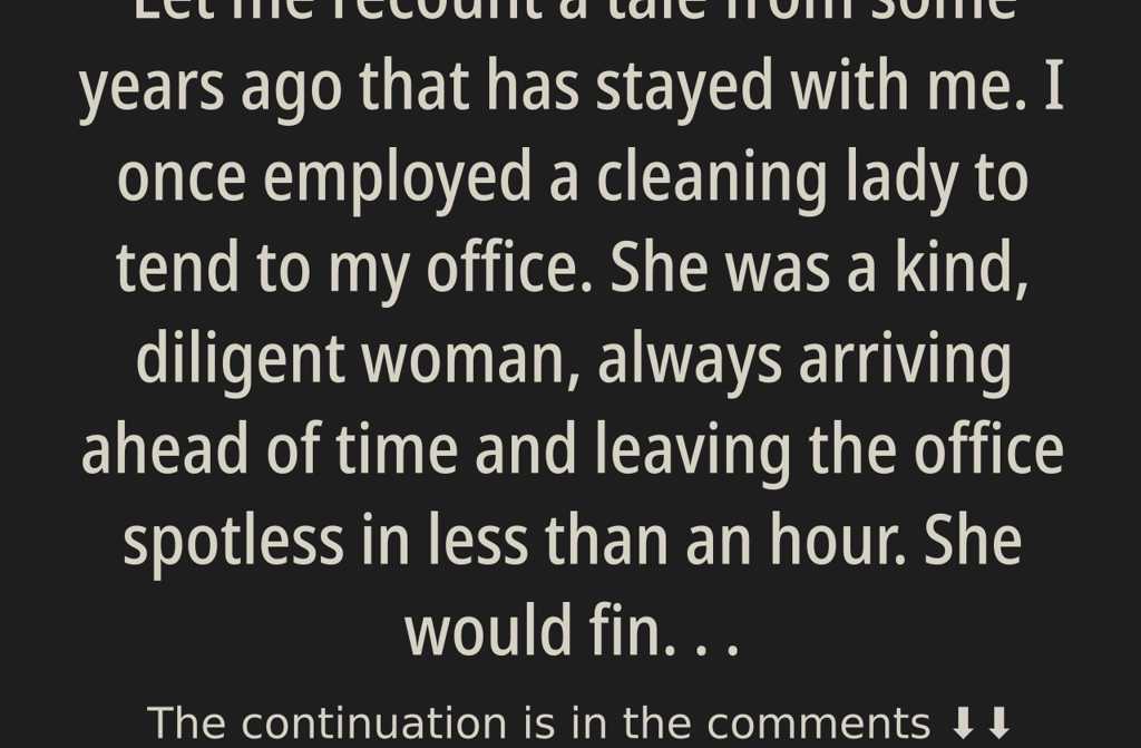 Let me recount a tale from some years ago that has stayed with me. I once employed a cleaning lady to tend to my office. She was a kind, diligent woman, always arriving ahead of time and leaving the office spotless in less than an hour. She would finish her work before a single member of staff set foot through the door.
