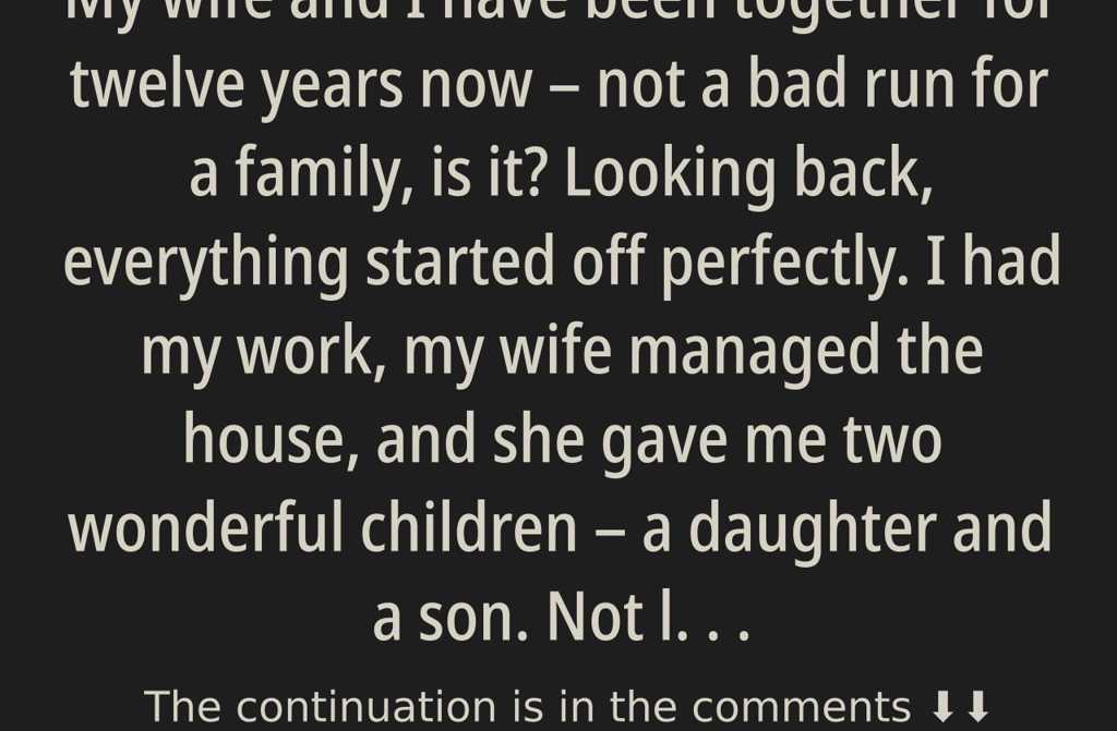 My wife and I have been together for twelve years now not a bad run for a family, is it? Looking back, everything started off perfectly. I had my work, my wife managed the house, and she gave me two wonderful children a daughter and a son.