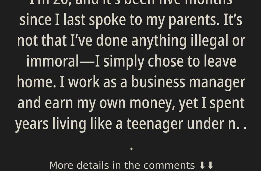Im 26, and its been five months since I last spoke to my parents. Its not that Ive done anything illegal or immoralI simply chose to leave home. I work as a business manager and earn my own money, yet I spent years living like a teenager under near-constant supervision. My parents are deeply religious and always believed strict control was their way of showing love and care. But to me, it gradually became suffocating.