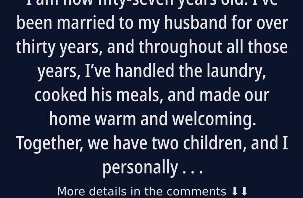 I am now fifty-seven years old. Ive been married to my husband for over thirty years, and throughout all those years, Ive handled the laundry, cooked his meals, and made our home warm and welcoming. Together, we have two children, and I personally saw to their upbringing and education in proper schools. I was always darting about, busy as a bee, working multiple jobs and picking up every extra shift to make sure our children wanted for nothing and looked just as smart as their peers.