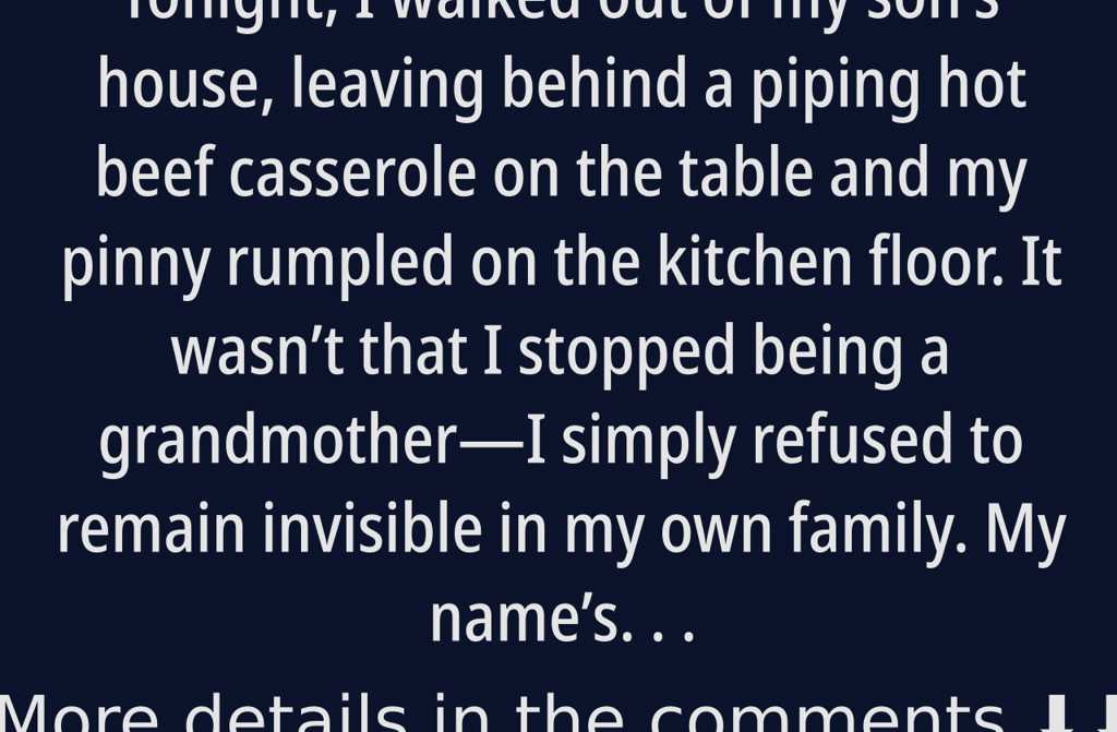 Tonight, I walked out of my sons house, leaving behind a piping hot beef casserole on the table and my pinny rumpled on the kitchen floor. It wasnt that I stopped being a grandmotherI simply refused to remain invisible in my own family.