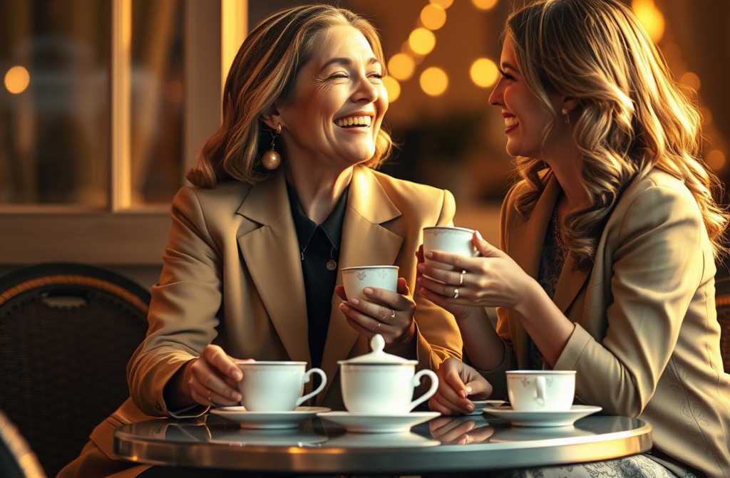 When she walked in, her mother greeted her with a teapot in one hand and a dazzling smile. No frumpy dressing gown herejust a chic beige trouser suit, manicured nails, and eyelashes that could *fan* someone.