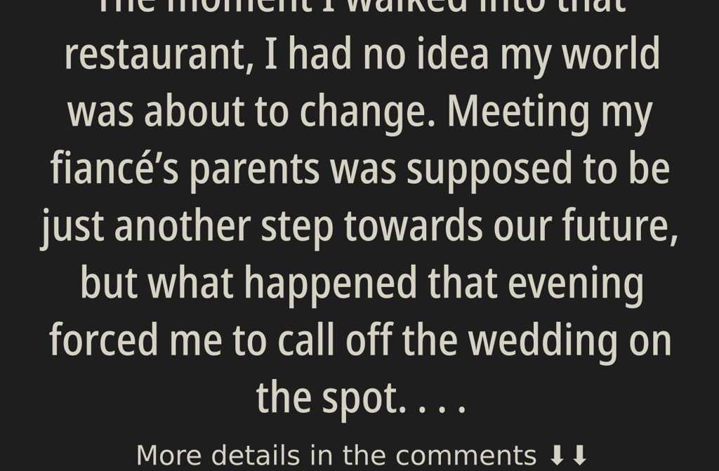 The moment I walked into that restaurant, I had no idea my world was about to change. Meeting my fiancés parents was supposed to be just another step towards our future, but what happened that evening forced me to call off the wedding on the spot.