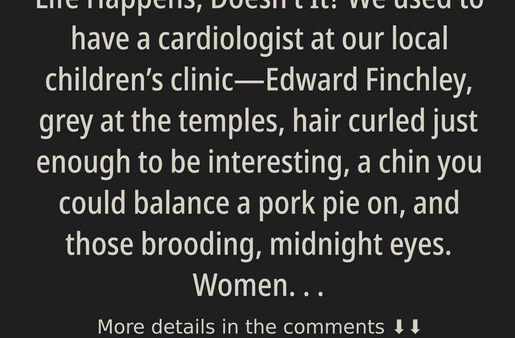 We used to have a cardiologist at our local childrens clinicEdward Finchley, grey at the temples, hair curled just enough to be interesting, a chin you could balance a pork pie on, and those brooding, midnight eyes. Women, naturally, developed acute conditions in his presence.