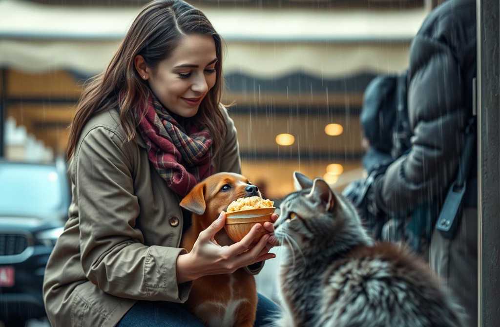 The next day, she brought them food. Deep down, she hoped theyd still be there. And they were. The cat meowed happily, the puppy wagged its tail. From then on, she left breakfast for them and something tasty in the evenings.