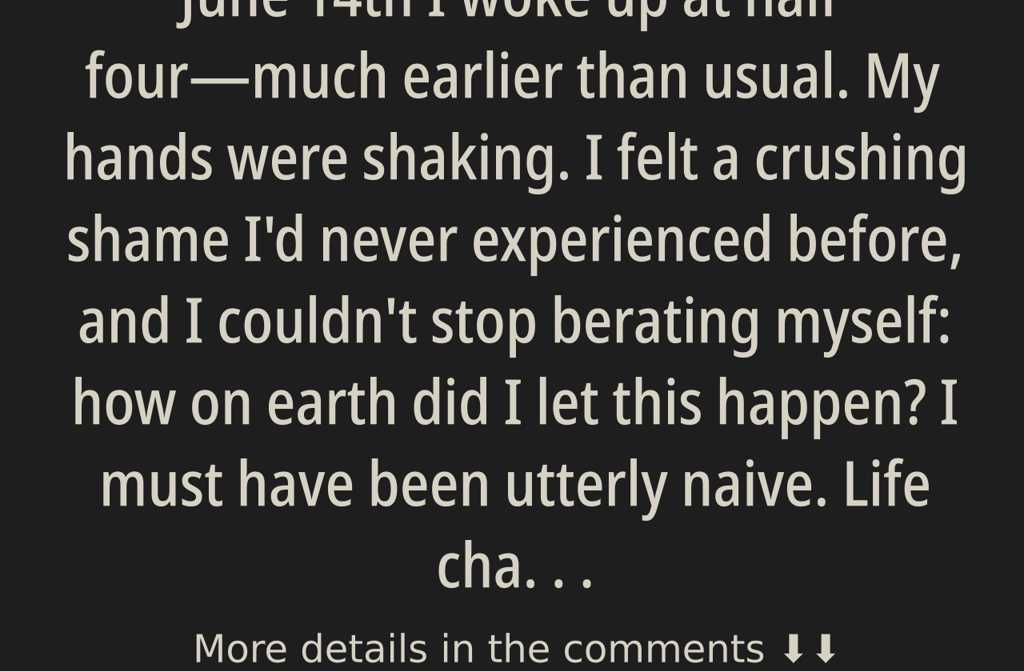 I woke up at half fourmuch earlier than usual. My hands were shaking. I felt a crushing shame I’d never experienced before, and I couldn’t stop berating myself: how on earth did I let this happen? I must have been utterly naive.