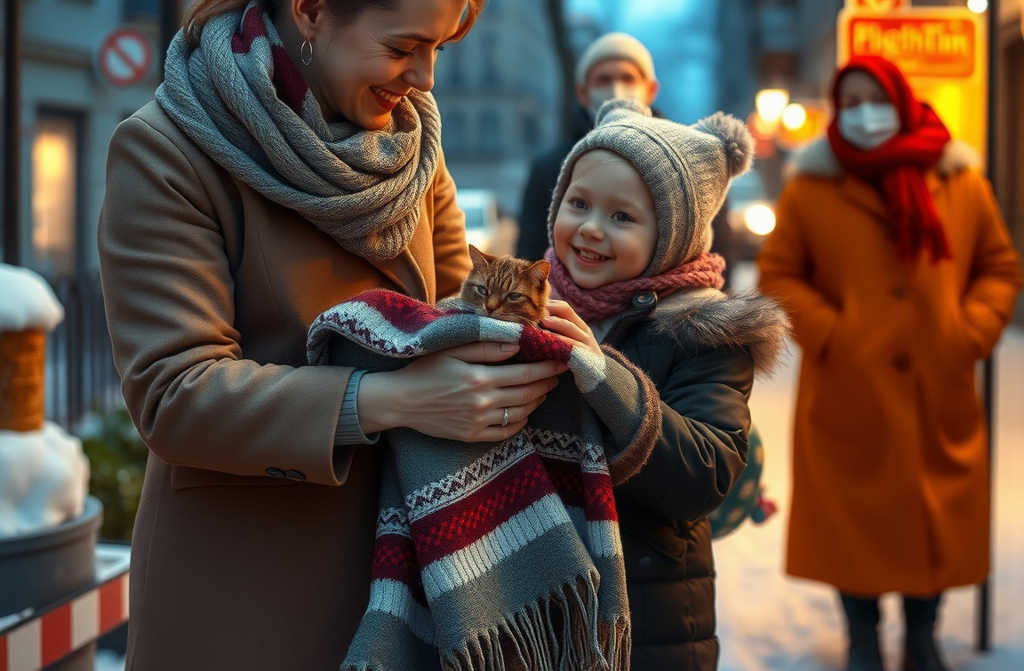 The girl clutched a scrawny, shivering cat wound in an old scarf.