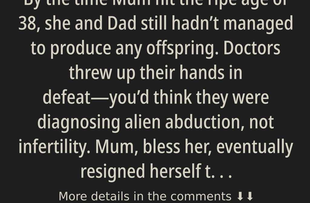 By the time Mum hit the ripe age of 38, she and Dad still hadnt managed to produce any offspring. Doctors threw up their hands in defeatyoud think they were diagnosing alien abduction, not infertility. Mum, bless her, eventually resigned herself to a childless fate. Dad? He wasn’t exactly losing sleep over it. Hed simply say, Dont fret, love, its fine, as though kids were optional extras, like heated seats in a car.