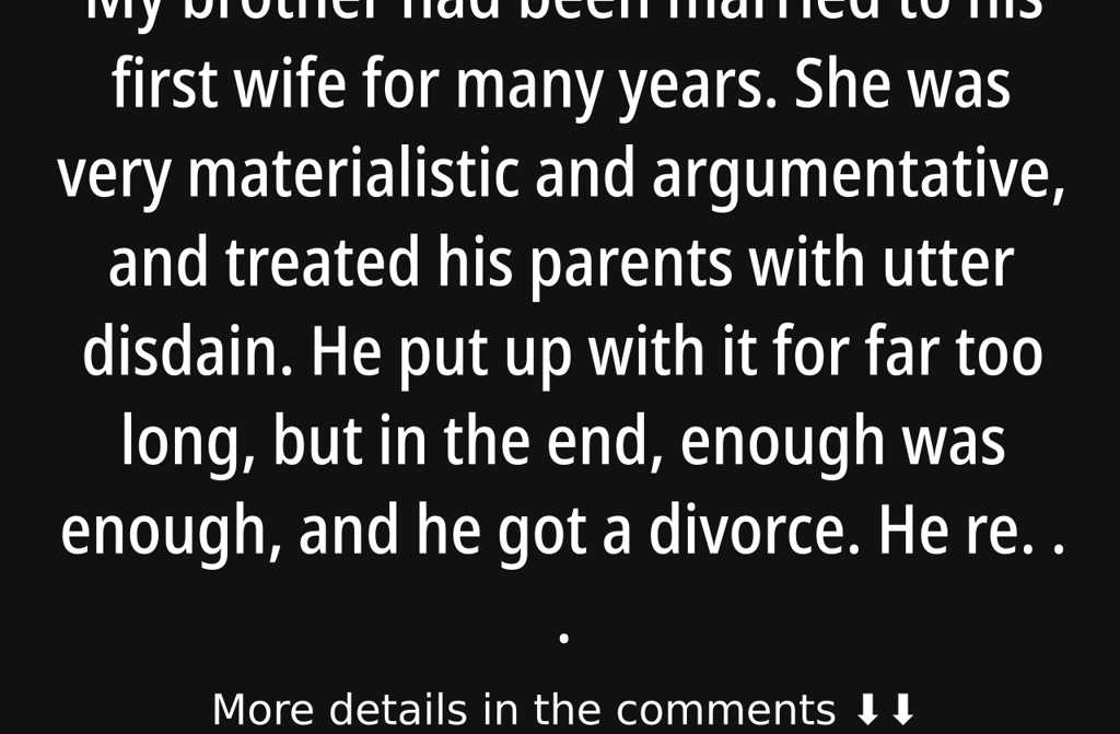 My brother had been married to his first wife for many years. She was very materialistic and argumentative, and treated...