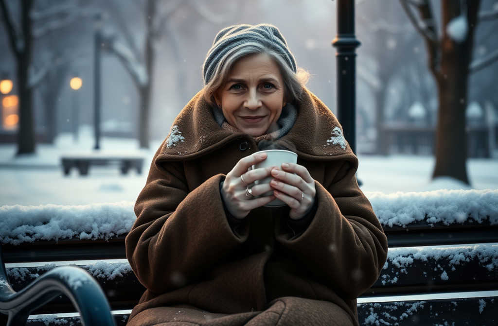 She wrapped her frozen hands around the steaming cup, warmth spreading through her fingers. She sat on a nearby bench under a lamppost.