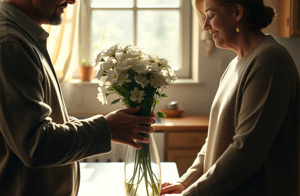 I agreed, and about twenty minutes later he arrived, holding a bouquet of white chrysanthemumsmy favourite.