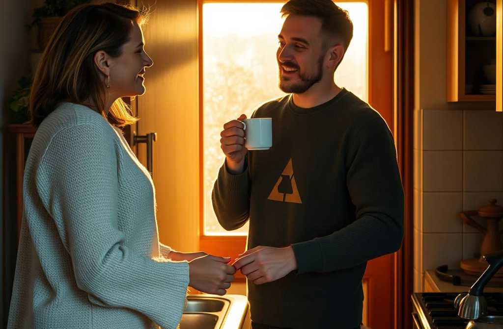 He strutted into the kitchen, grinning like a freshly polished kettle, oblivious to the tension hanging in the air. Seeing Emily on the stool, his smile widened.