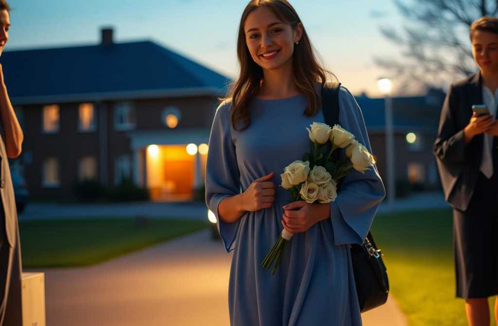 On graduation day, Irene started with a trip to the hairdresser, got a light makeup, and slipped into that blue dress with a pair of heels. She glanced at herself in the mirror fortytwo, not young but still presentable, silver strands hidden beneath the dye, fine lines softened by foundation. She took a bouquet of white roses she had bought earlier, called a black cab, and gave the driver the schools address.