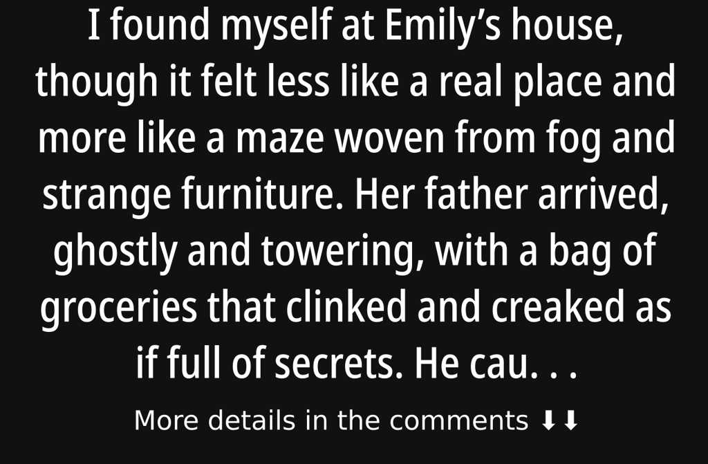 I found myself at Emilys house, though it felt less like a real place and more like a maze woven from fog and strange furniture. Her father arrived, ghostly and towering, with a bag of groceries that clinked and creaked as if full of secrets. He caught us lounging in the living room, which was really a forest of half-finished paintings and odd, ticking clocks. His chin shot up like it was breaking free, and disapproval brooded across his face like thunder rolling through London.