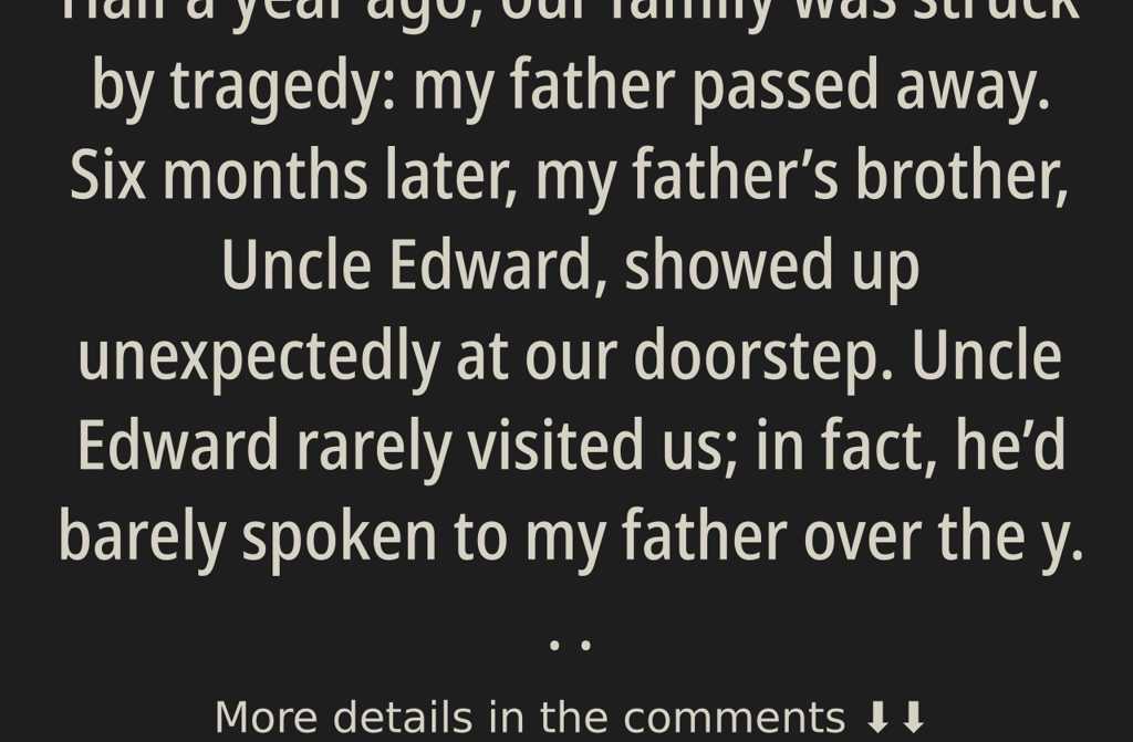 Half a year ago, our family was struck by tragedy: my father passed away. Six months later, my fathers brother, Uncle Edward, showed up unexpectedly at our doorstep. Uncle Edward rarely visited us; in fact, hed barely spoken to my father over the years. They hadnt argued, but there was never any warmth between them. Both kept their distance and led separate lives.