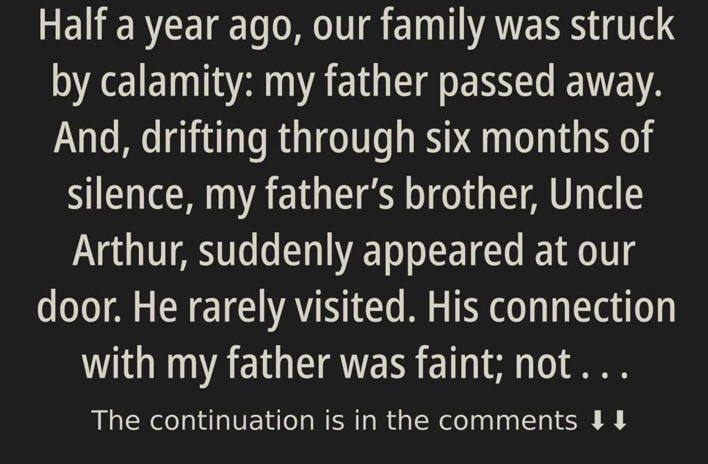 Half a year ago, our family was struck by calamity: my father passed away. And, drifting through six months of silence, my fathers brother, Uncle Arthur, suddenly appeared at our door. He rarely visited. His connection with my father was faint; not enemies, but never companions, their interactions were always cool, distant, like two stars orbiting in opposite galaxies. Each led a life entirely apart from the other.