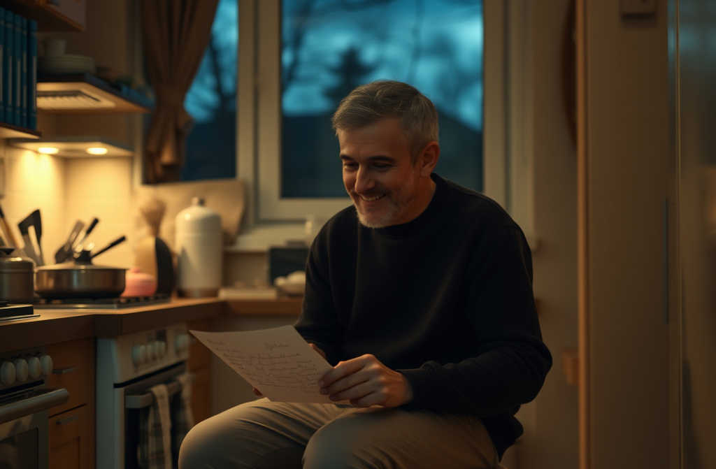 He drops the phone on the table, screen down. The egg is sizzling gently in the pan. Next room, someones laughing.