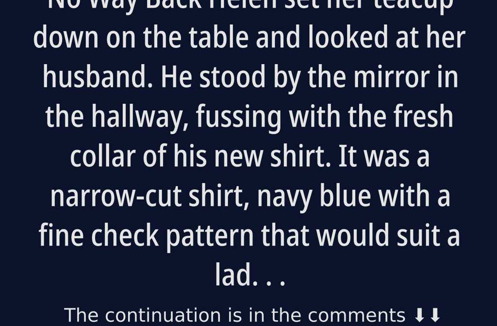 Helen set her teacup down on the table and looked at her husband. He stood by the mirror in the hallway, fussing with the fresh collar of his new shirt. It was a narrow-cut shirt, navy blue with a fine check pattern that would suit a lad of about twenty-five not a man turning fifty in a months time.