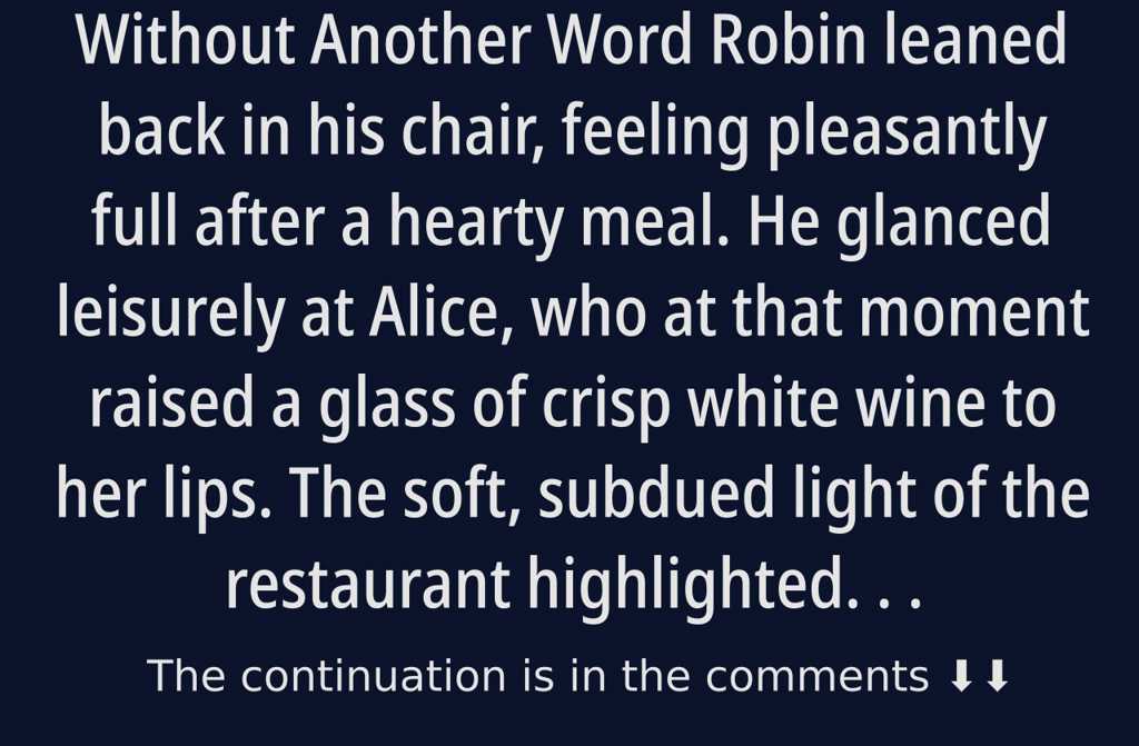 Robin leaned back in his chair, feeling pleasantly full after a hearty meal. He glanced leisurely at Alice, who at that moment raised a glass of crisp white wine to her lips. The soft, subdued light of the restaurant highlighted her fine, delicate features. A hint of blush on her cheeks looked natural, and her eyes shone warmly, reflecting the gentle glow from the lamps above their table.