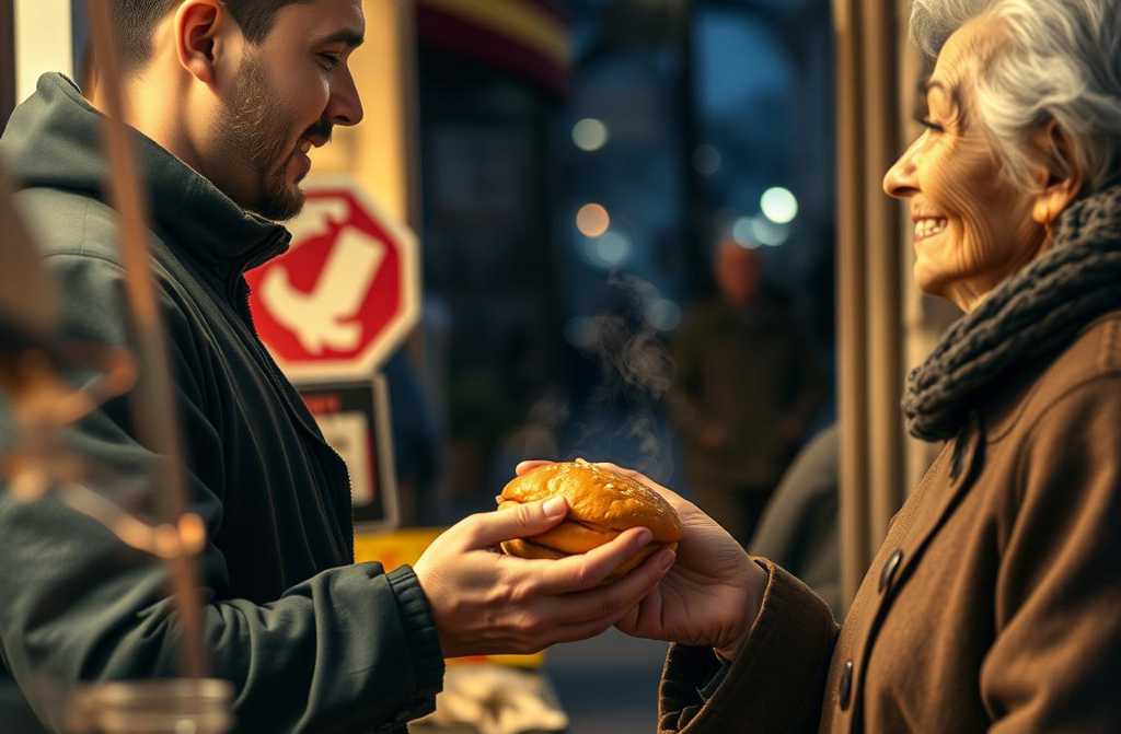 Her voice trembled, warm yet shy, as if she were apologising merely for daring to desire. A thin scarf was knotted tight under her chin, and the threadbare coat sagged heavily on her shoulders. She had long passed the years when cravings were whispered about, yet the scent of sizzling meat and toasted bun coaxed forgotten memories to the surface.